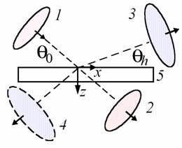 1 – падающий лазерный рентгеновский импульс, 2 - прошедший импульс, 3 - отраженный импульс в случае Брэгга и в случае Лауэ (4), 5 - монокристалл.