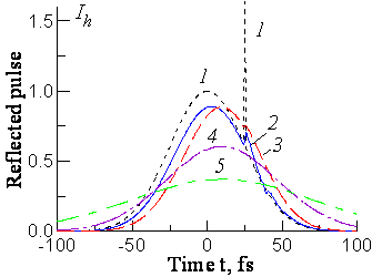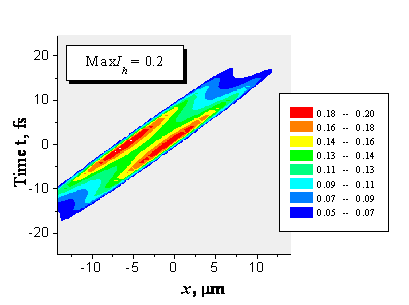Интенсивности R- и T-импульсов зависят от времени, координаты и спектральной отстройки e = W/DWB, где DWB – спектральная ширина отражения от идеального кристалла (рис. 1). Наличие неоднородного температурного поля приводит к уменьшению интегрального (по x, y и t) коэффициента прохождения, к его уширению, асимметрии и к смещению минимума в отрицательную область спектра (рис. 2). Кроме того, очень необычным по сравнению с “холодным” кристаллом является пространственное по поверхности кристалла распределение интенсивности отражения (рис. 3), что необходимо будет учитывать при проведении соответствующих экспериментов.