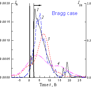 Дифракционное отражение двух импульсов с длительностями t0 = 0.1 фс. Расстояние от кристалла z (см): 1 - 0, 2 - 2, 3 - 10, 4 - 20. Случай Брэгга, b = 2, l = 0.154 нм, Si(220), d = 4 mm.