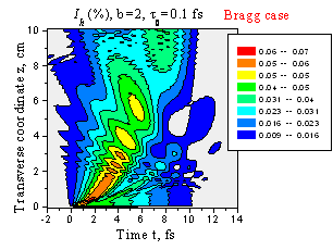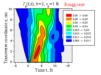Пространственно-временное распределение интенсивности отраженного импульса с длительностью t0 = 1 фс. Случай Брэгга, 1 - b = 1, 2 - b = 2.