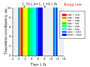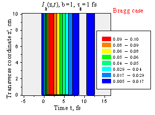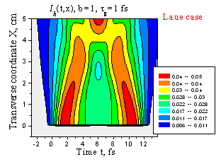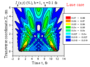 Пространственно-временное расплывание отраженного лазерного импульса при t0 = 1 фс (a) и t0 = 0.1 фс (b). Геометрия Лауэ, b = 1, l = 0.154 нм, Si(220), d = 7.7 mm.