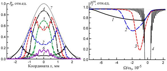 Рис. 1. Интегральные коэффициенты отражения PR(x) при e = -2 (1), -3 (2), -3.5 (3), -4 (4), -4.5 (5) и e = –5 (6); 7 – профиль интенсивности I0(x, 0, z), начальная температура T0 = 200 K, время от начала падения пачки импульсов t = 600 мкс. Кристалл алмаза толщиной 100 мкм, отражение (400).