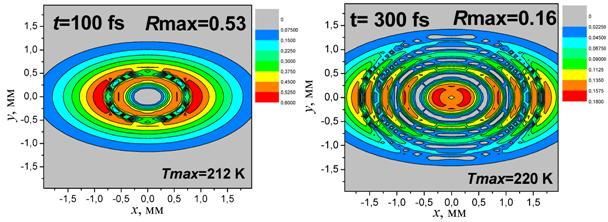Рис. 3. Карта распределения интенсивности отражения IR(x, y) в области спектра e = -3 в моменты времени 100 и 300 фс.